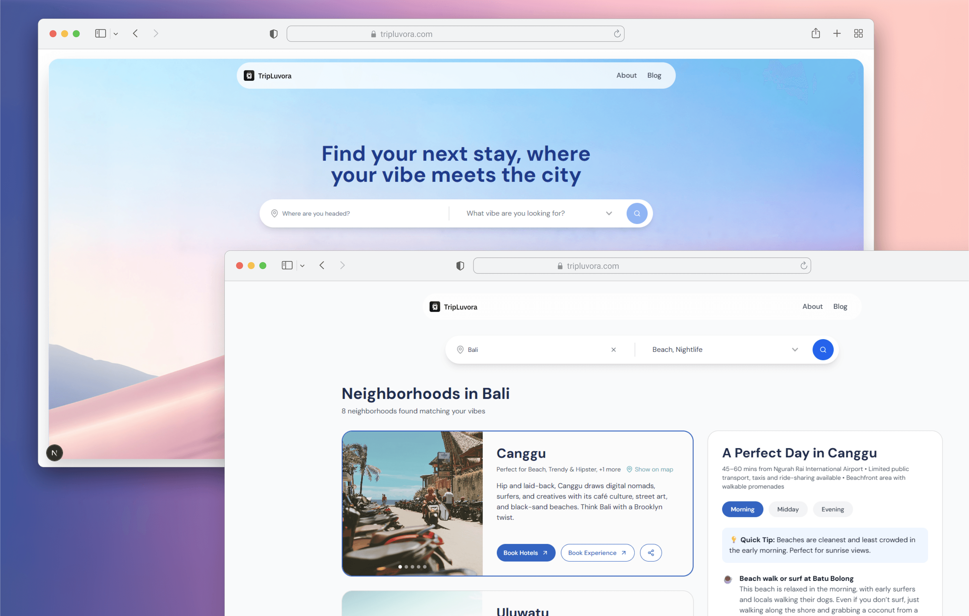 TripLuvora started from a personal pain point. Every time I plan a trip, I spend hours researching where to stay. It’s not just about finding a place with good reviews. I want the area to match my vibe — whether I’m traveling to unwind, explore local culture, or dive into the nightlife. This kind of research takes time and effort, often across many tabs, apps, and maps.