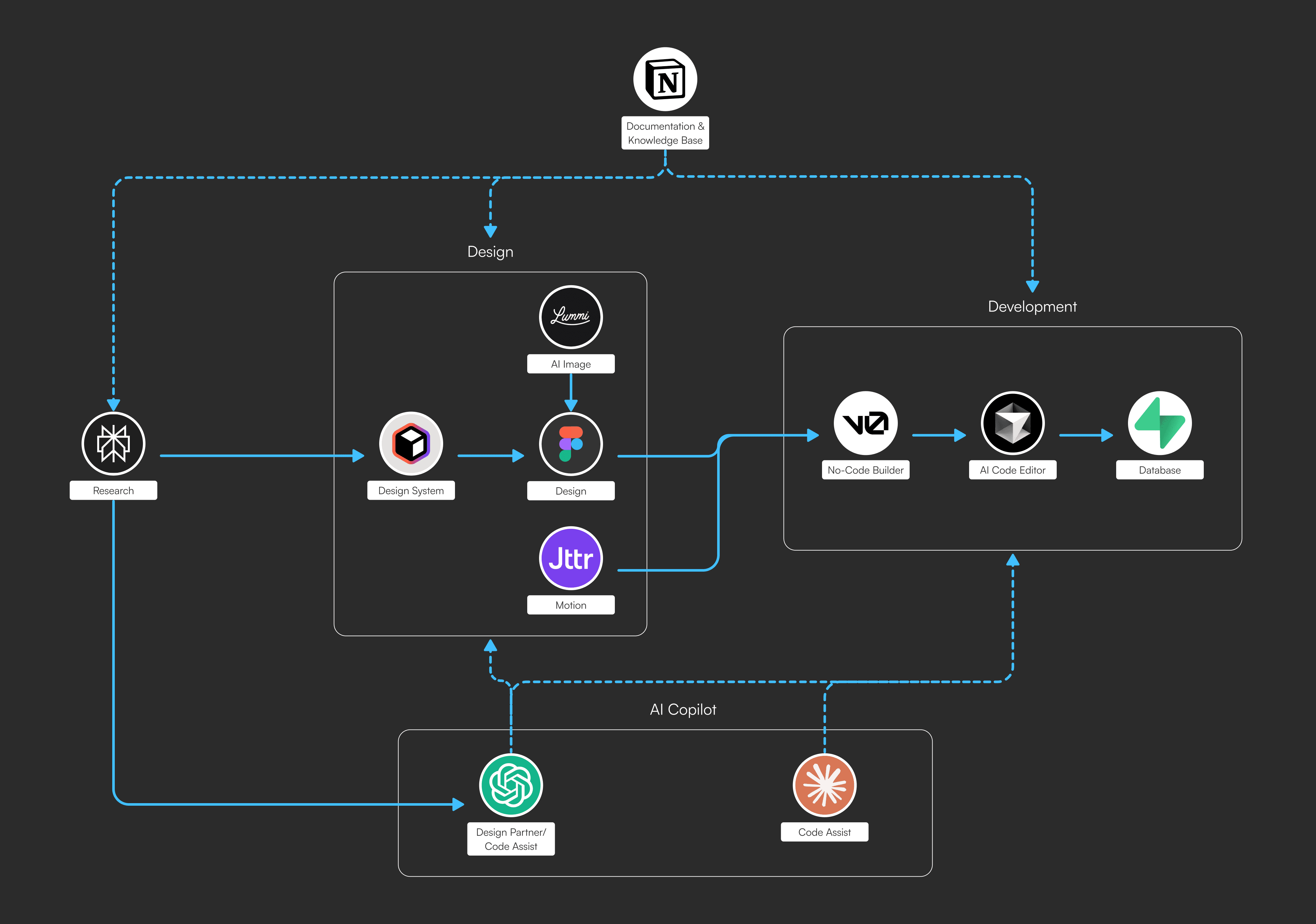 The workflow is organized into three main parts: Research, Design, and Development, all supported by AI copilots and centralized documentation in Notion.