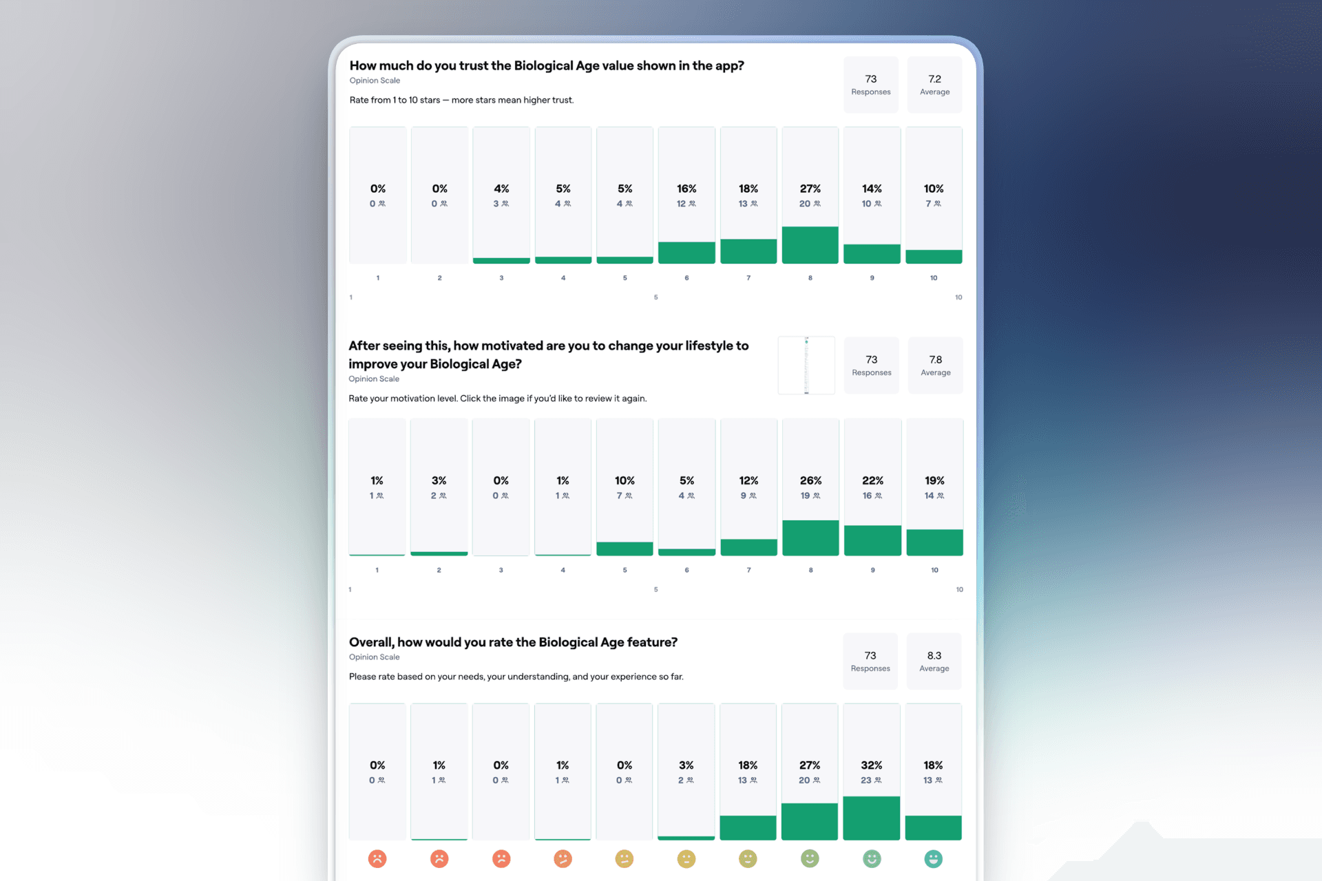 Trust in the Bio Age value averaged 7.2 out of 10. Given that the estimate is based on self-reported data with stated uncertainty, a 7.2 trust score is a meaningful result — users understood the limitations and still found the metric credible and useful.