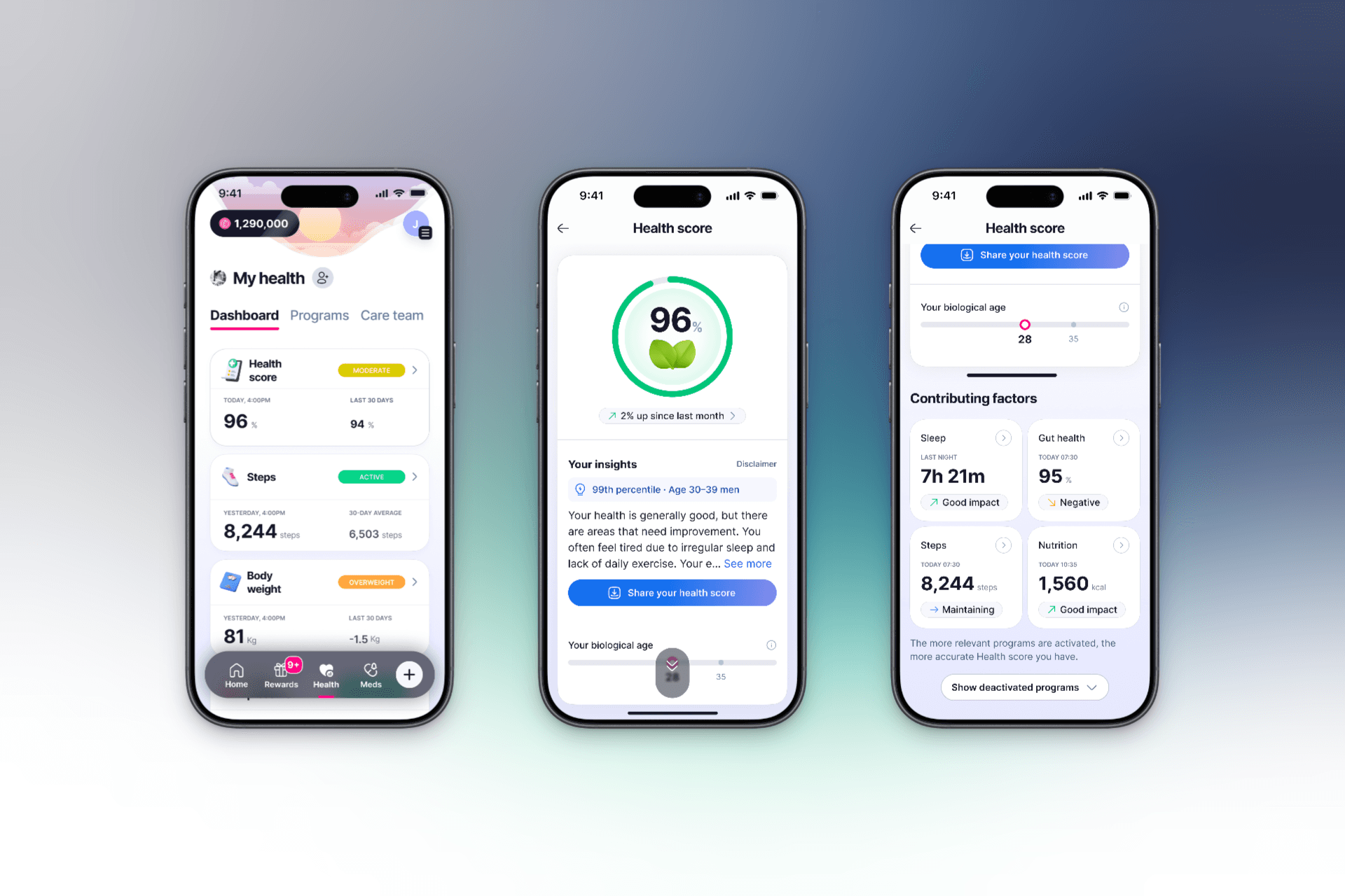 The early explorations established the conceptual architecture: biological age embedded alongside the health score, contributing factors broken down by category, a confidence indicator visible rather than hidden, and AI-generated insights contextualising what the number meant for the individual user. Three layout variants were explored in parallel to test different approaches to information density and visual hierarchy before committing to a direction.