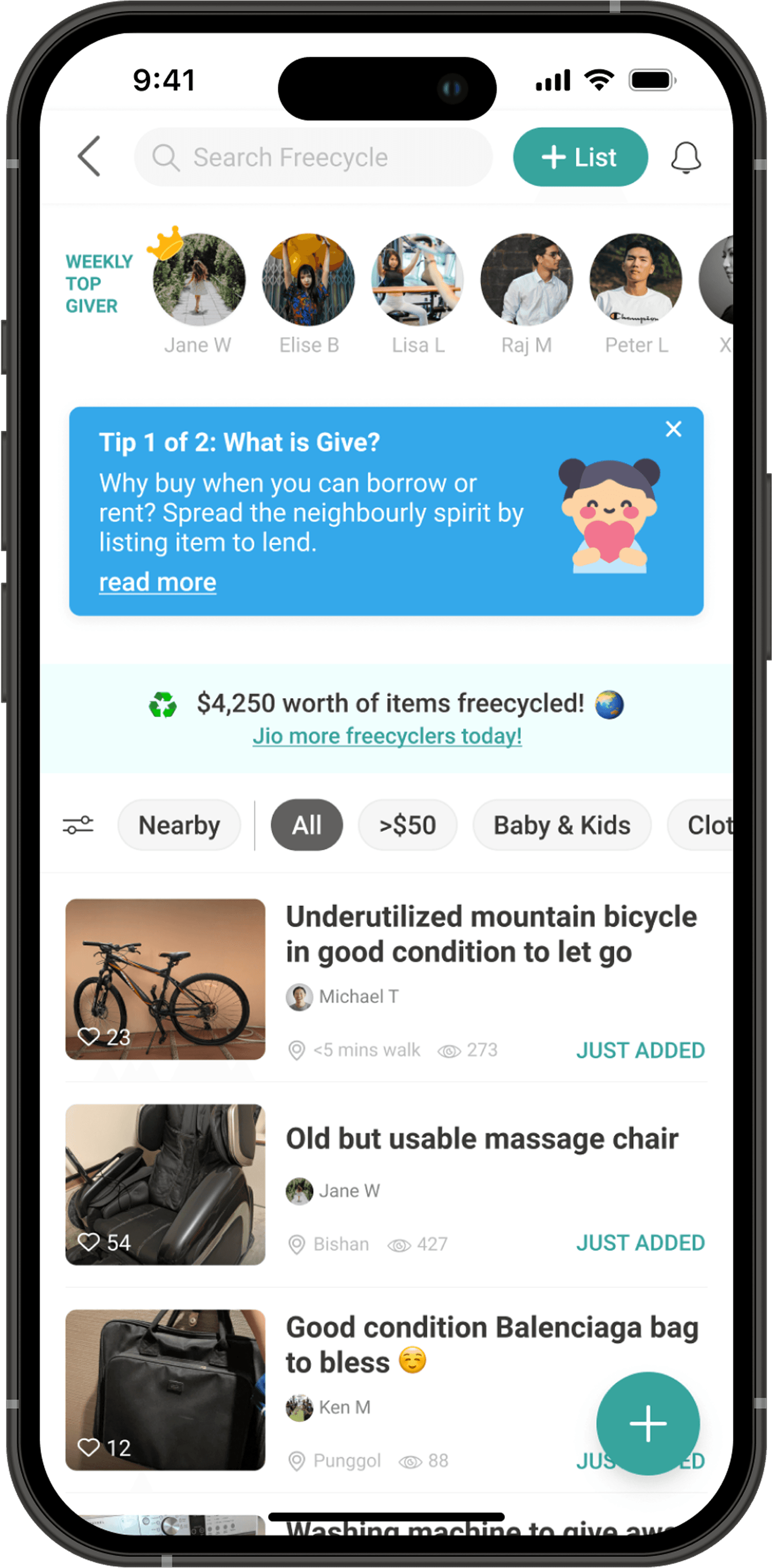 To encourage more participation in giving away free items, we introduced a light gamification system within the Give feature. Users earned badges and small rewards for listing items and completing successful giveaways. This not only increased the number of items posted but also fostered a stronger sense of contribution and pride within the community.