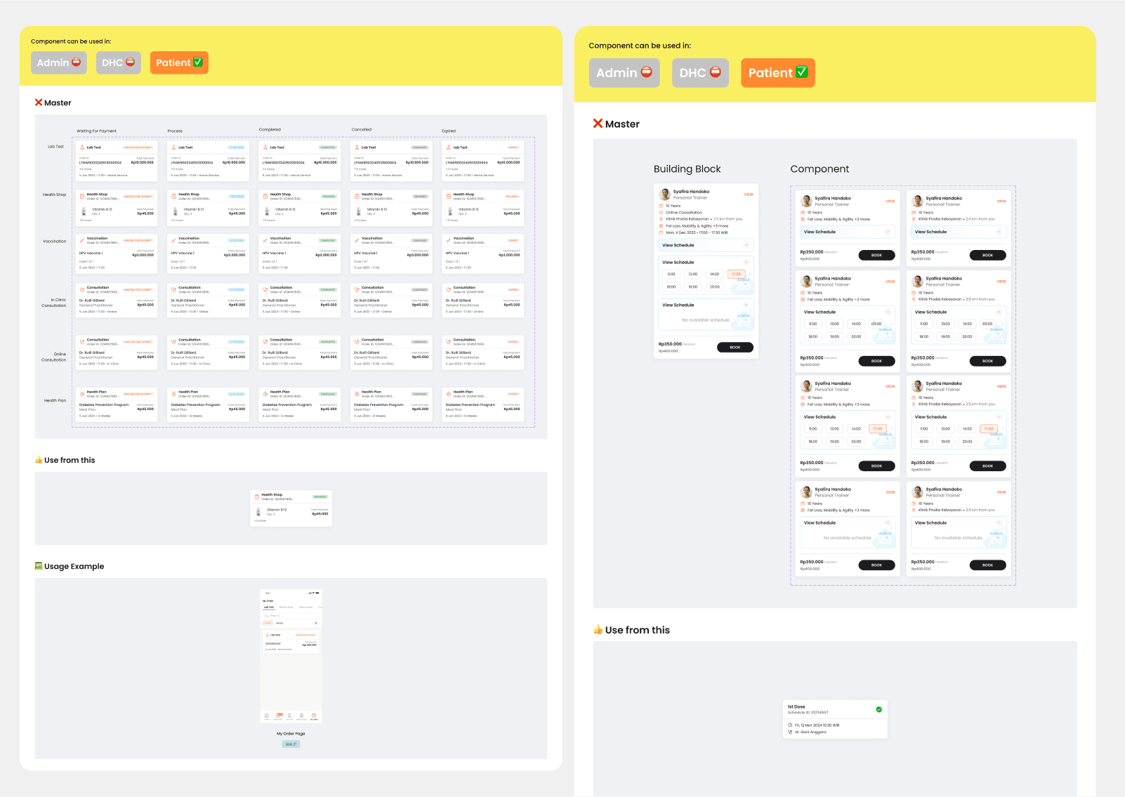 To scale our efforts across three platforms, we built a comprehensive style guide and a reusable component library. This not only ensured consistency across the Patient App, DHC App, and Admin Web, but also laid the foundation for a cohesive and scalable visual system that could evolve with the product.