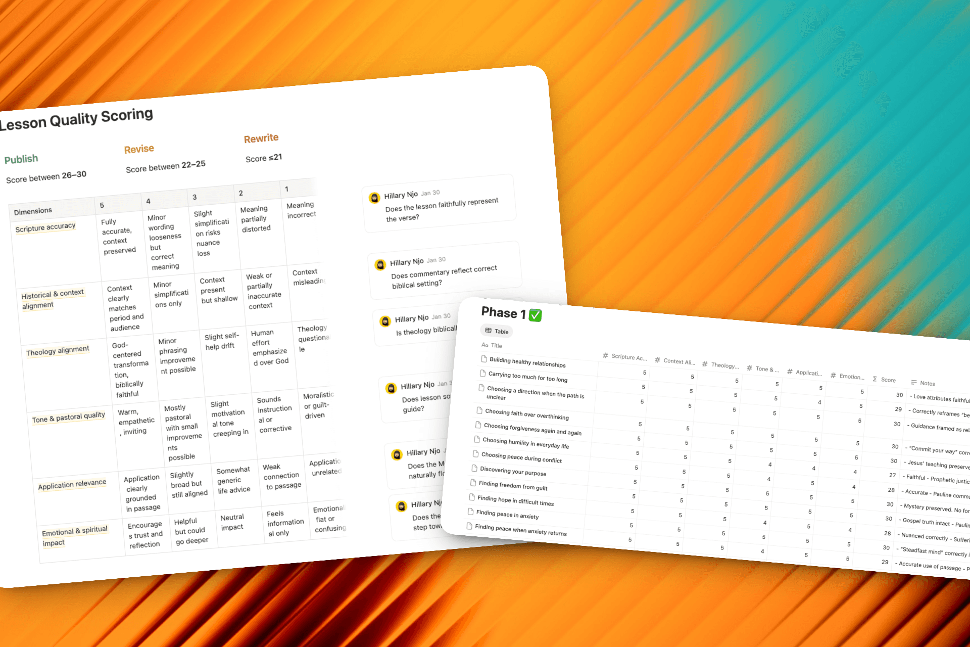 Generating content about Scripture carries real responsibility. An inaccurate interpretation, a tone-deaf application, or a theologically skewed framing could do more harm than no content at all. To address this, a structured evaluation framework was introduced to assess every lesson across six dimensions before it went live.