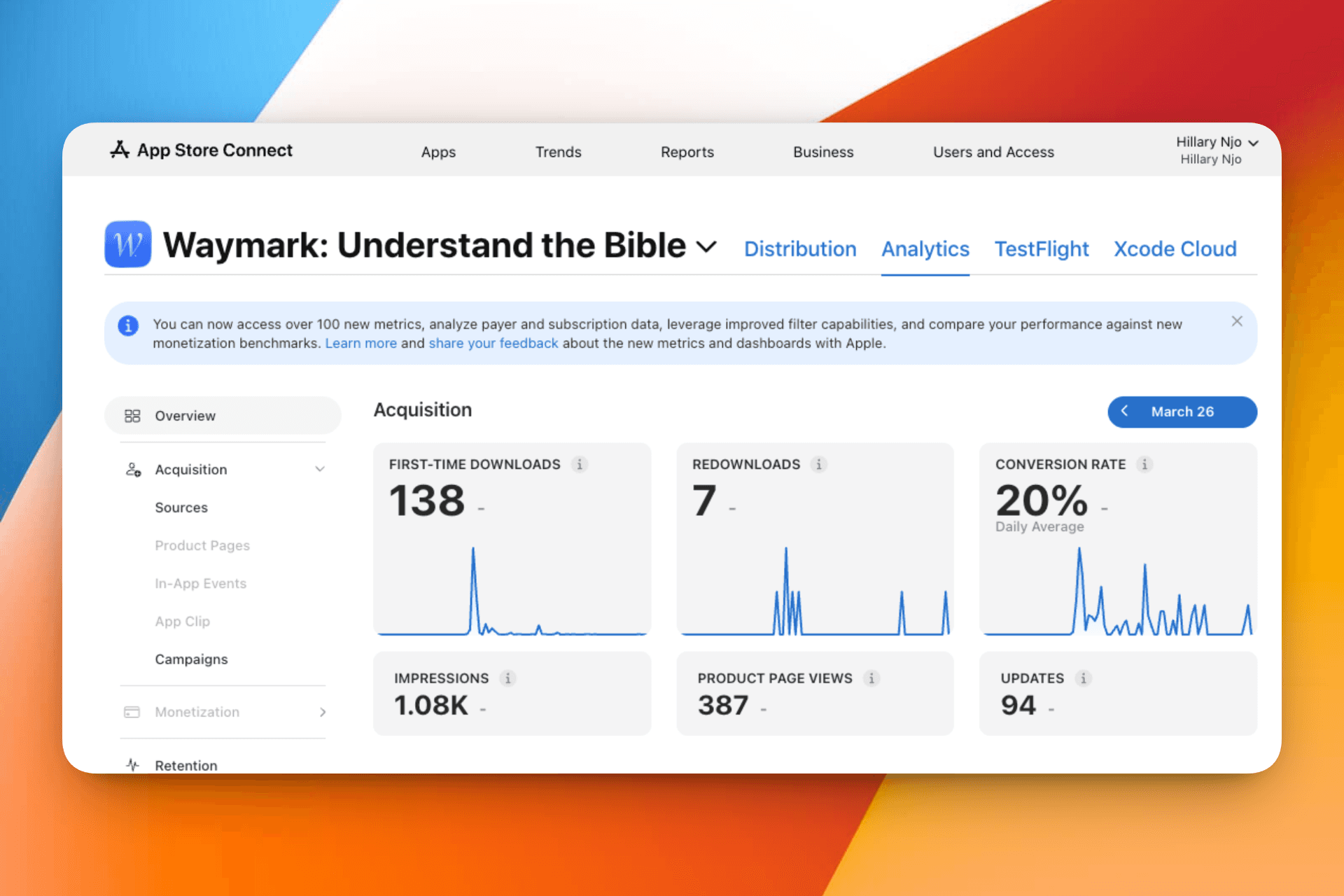 The largest update since launch is currently awaiting App Store approval. It includes a rebuilt lesson experience, a new journal, home screen widgets, dark mode, and offline support. These numbers reflect only what the earliest, most unfinished version of Waymark could do. The clearer signal comes next.